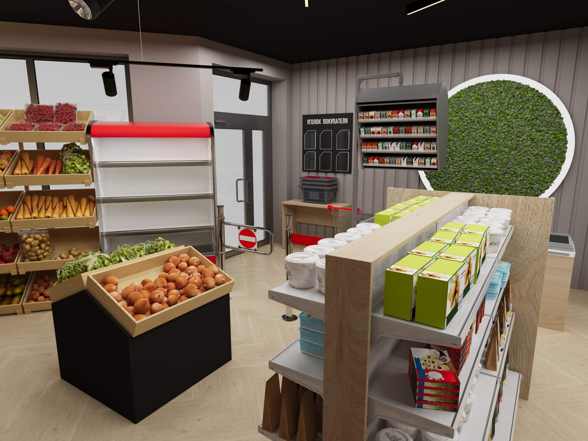 Интерьер выдержан в светлой цветовой гамме, создающей ощущение чистоты и простора, что особенно важно для места, где покупатели выбирают продукты.