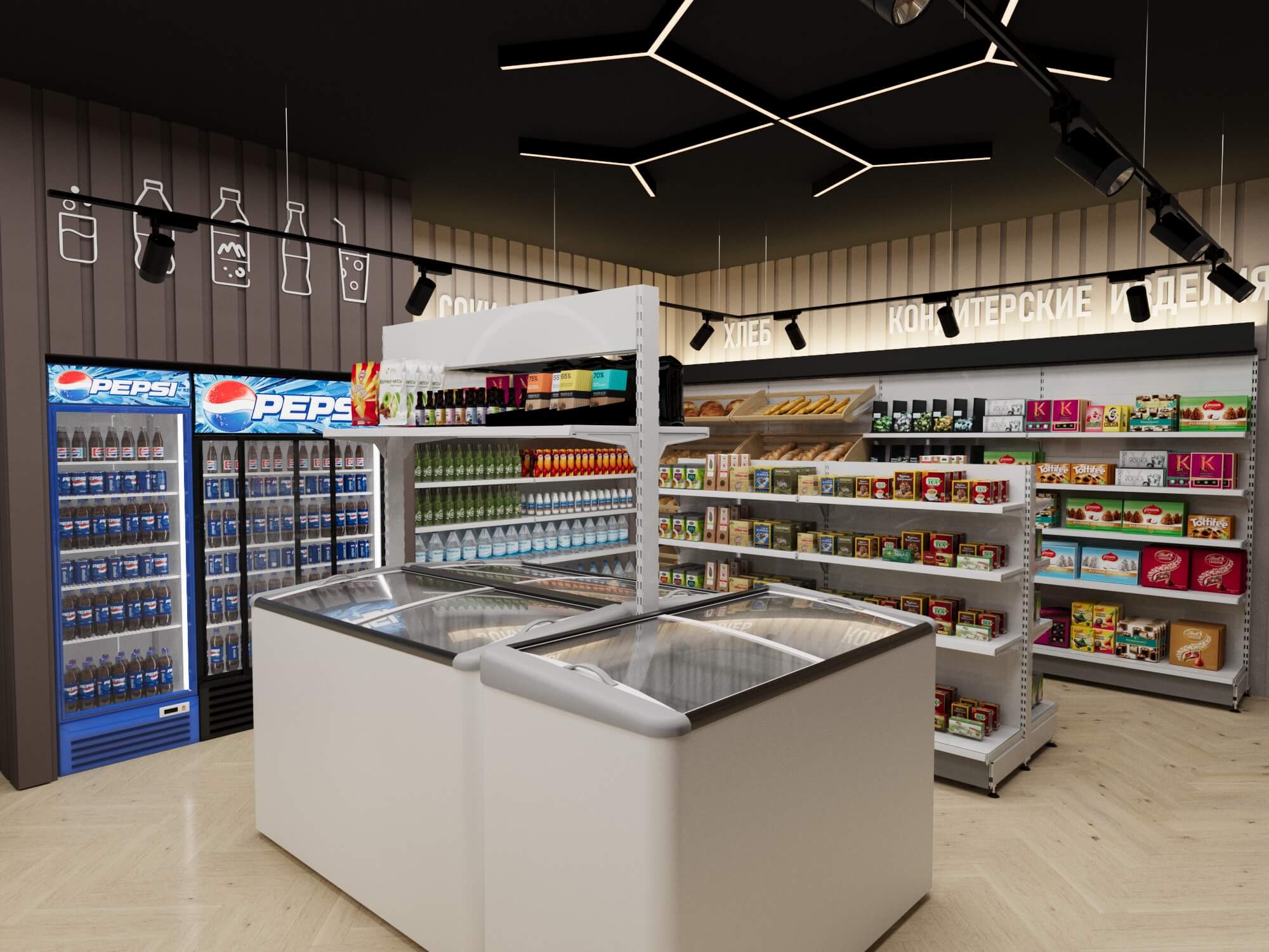 Современное торговое оборудование с четкими геометрическими формами и продуманная навигация формируют образ клиентоориентированного магазина.