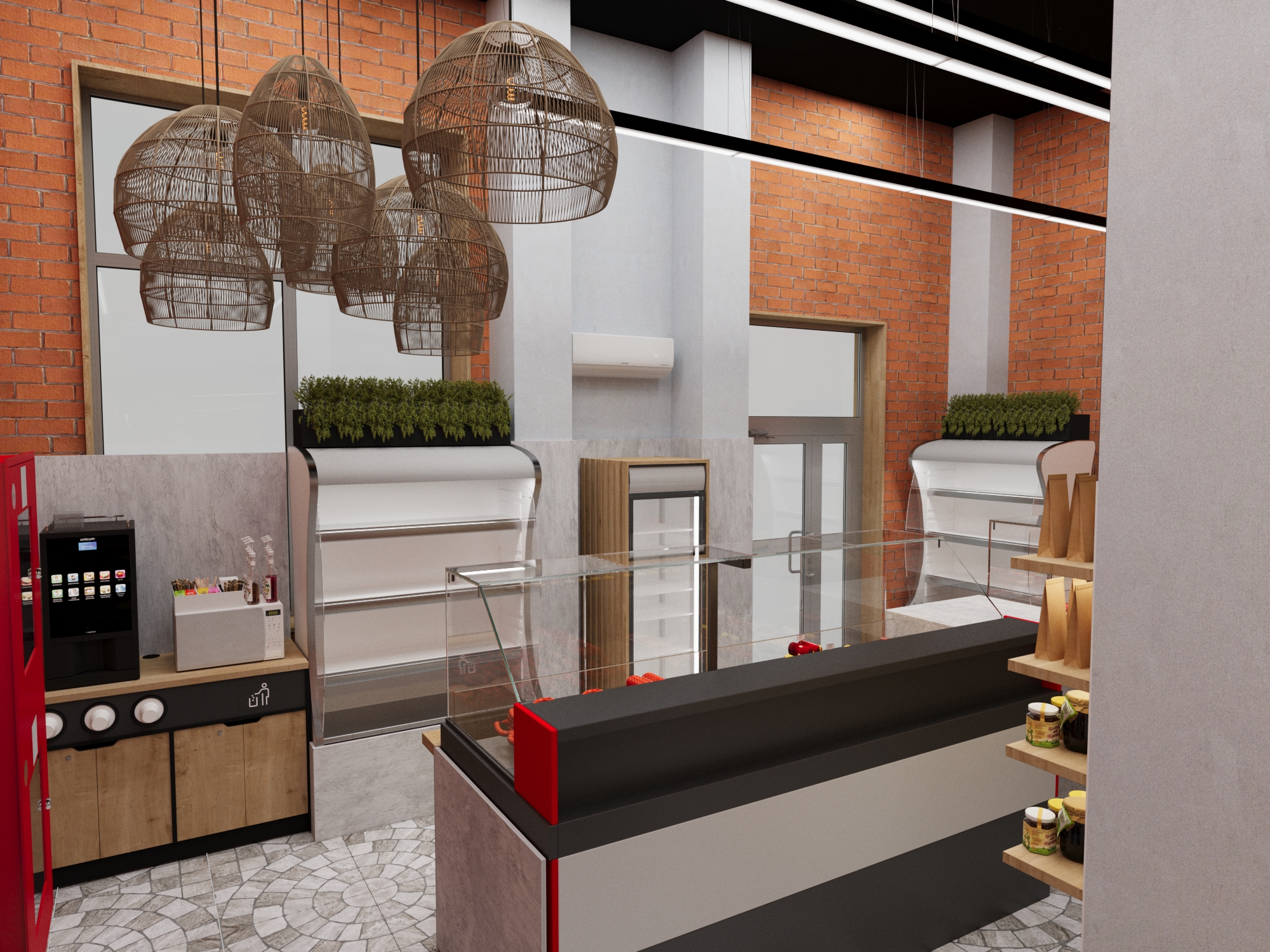 Слева от витрины расположена профессиональная кофейная зона с эспрессо-машиной, что подчеркивает мультиформатность заведения.