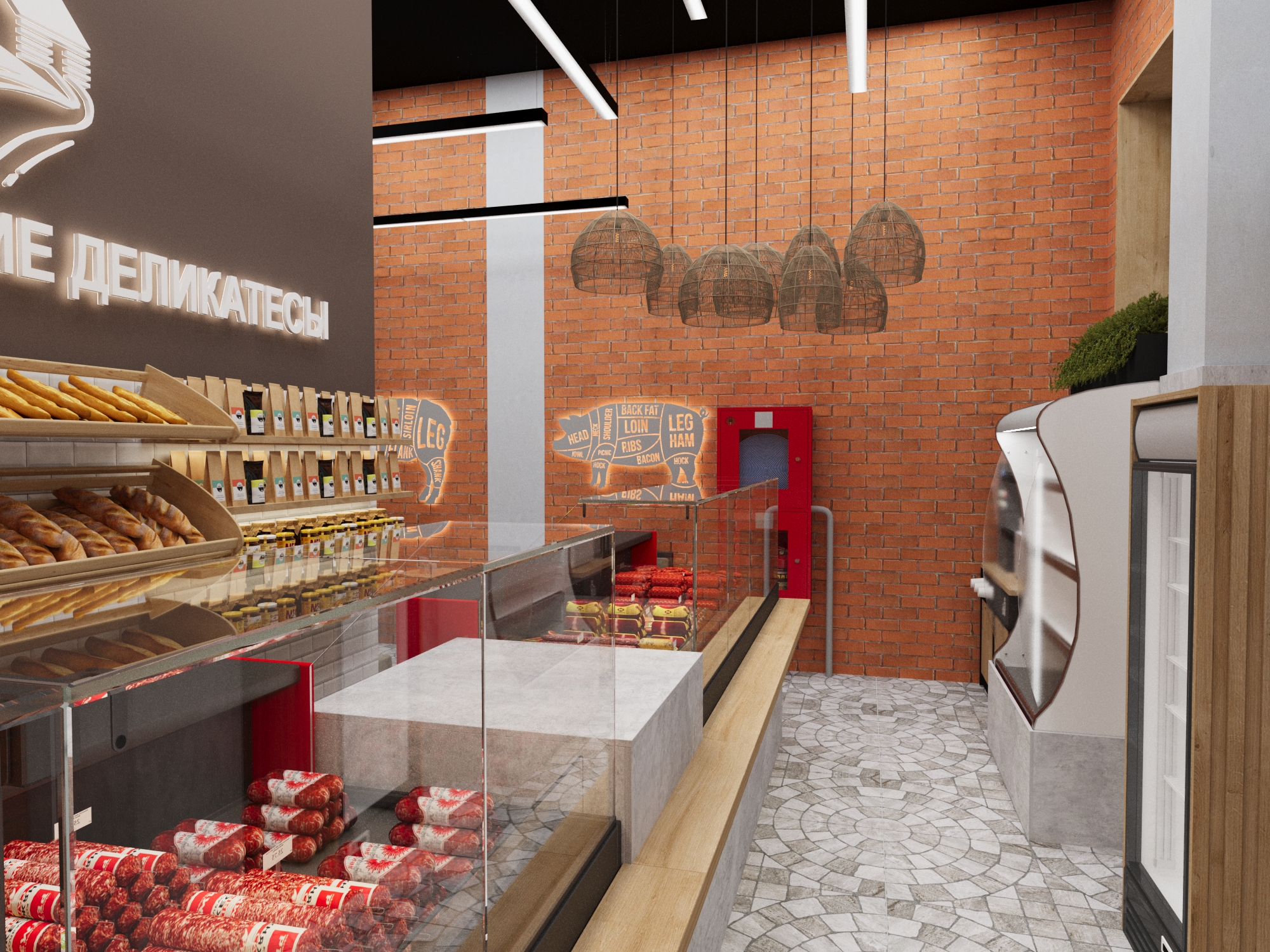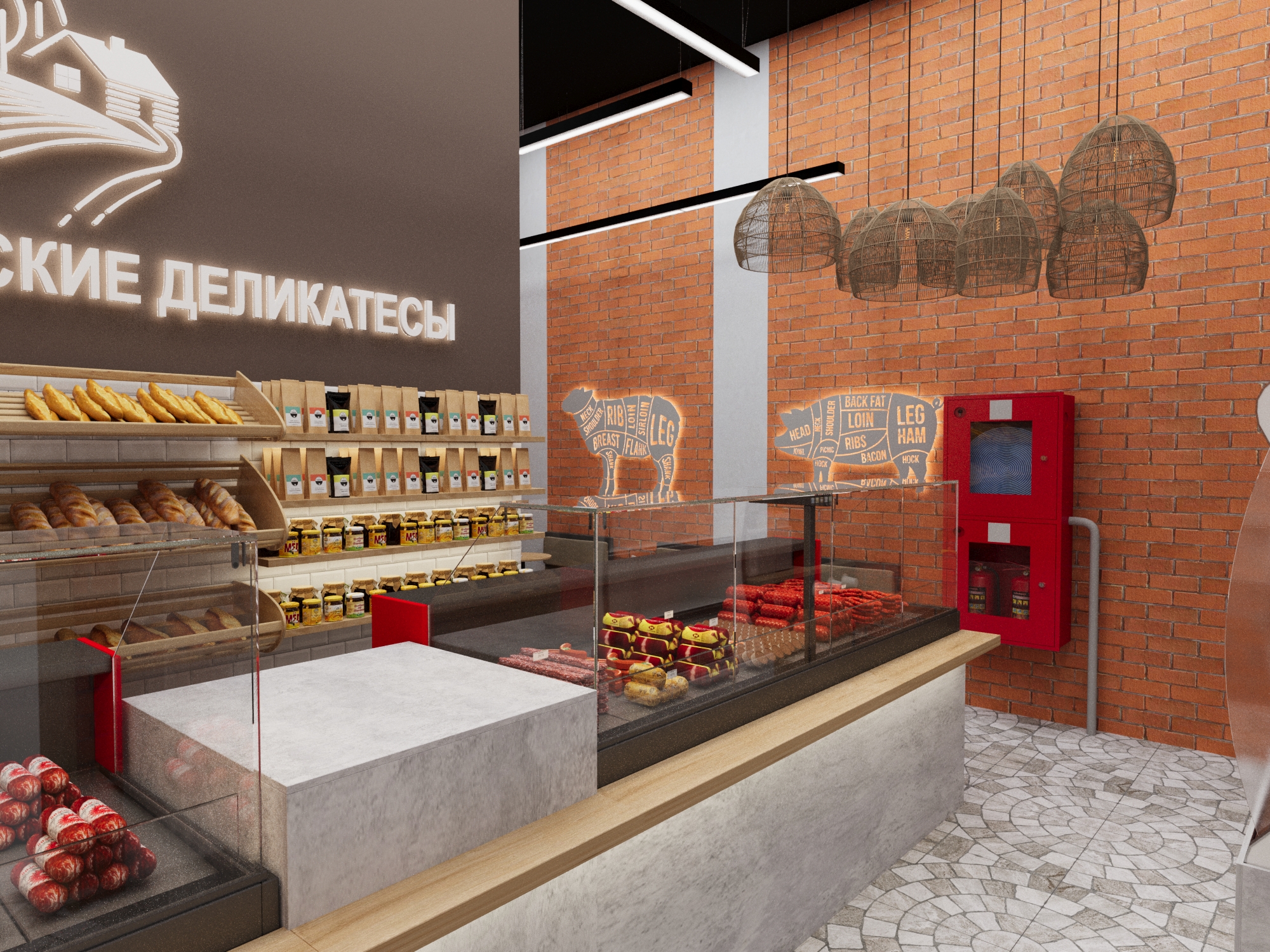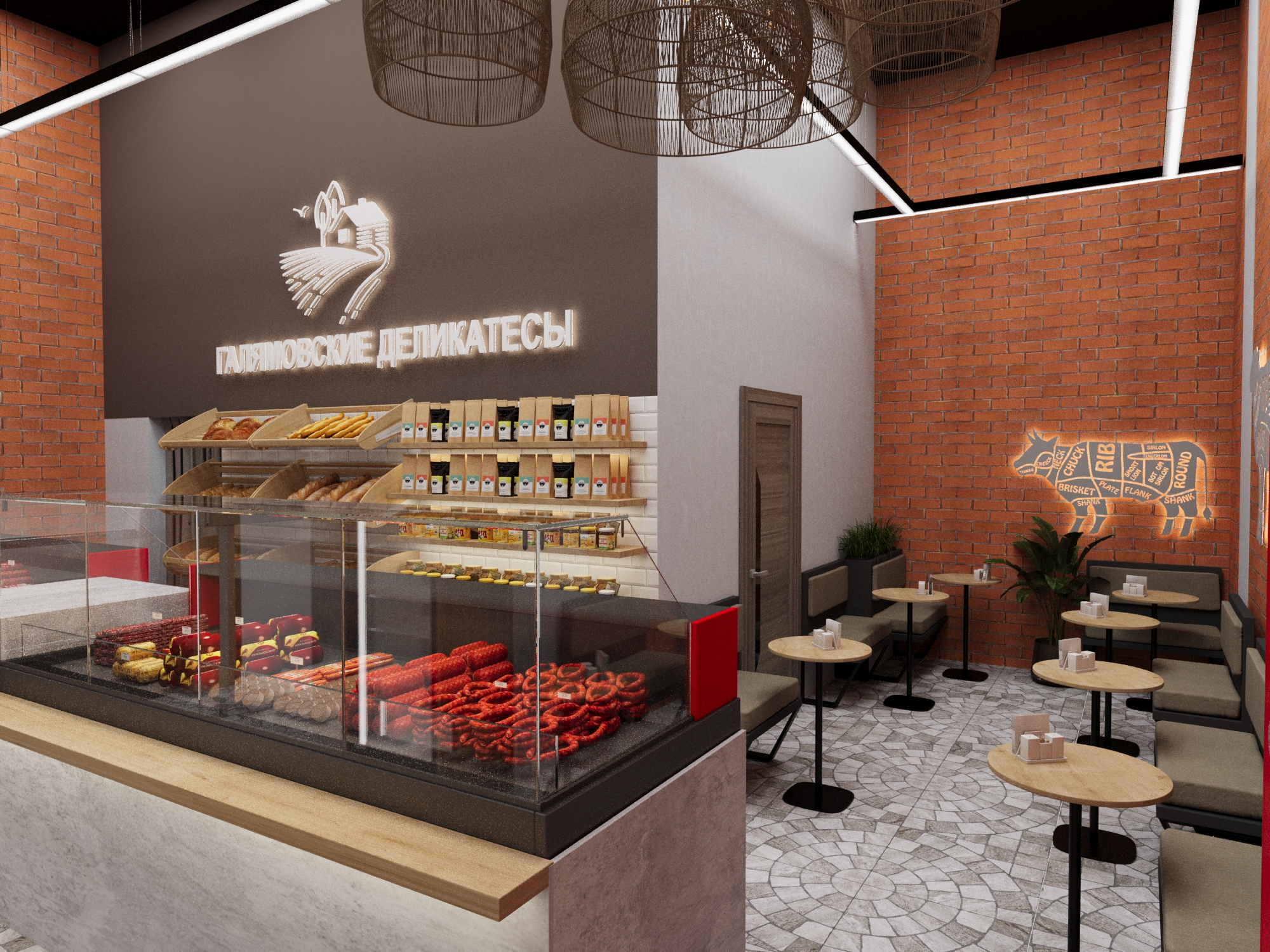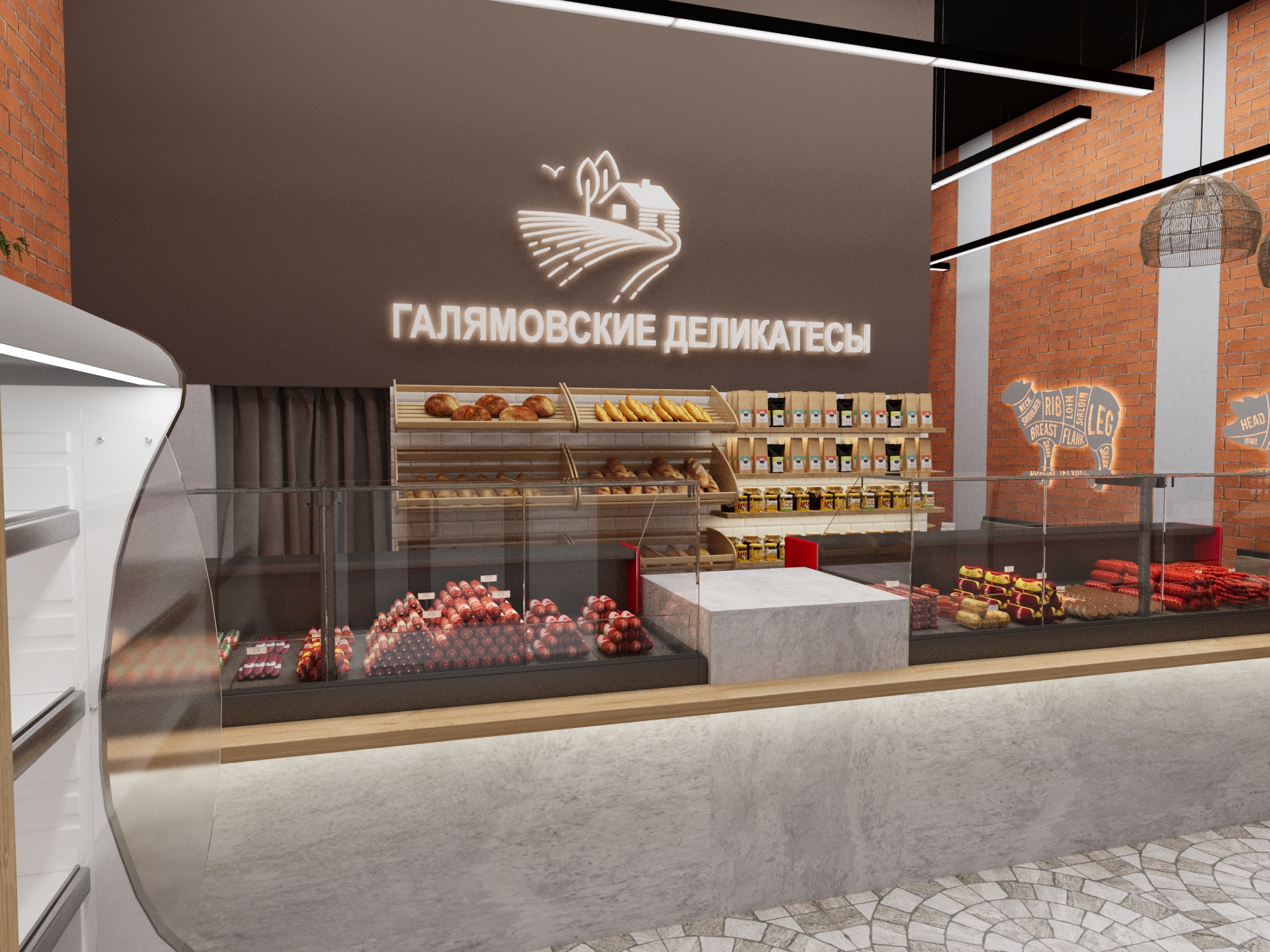 Магазин «Галямовские деликатесы» представляет собой гармоничное сочетание современного дизайна и традиционной атмосферы гастрономической лавки.