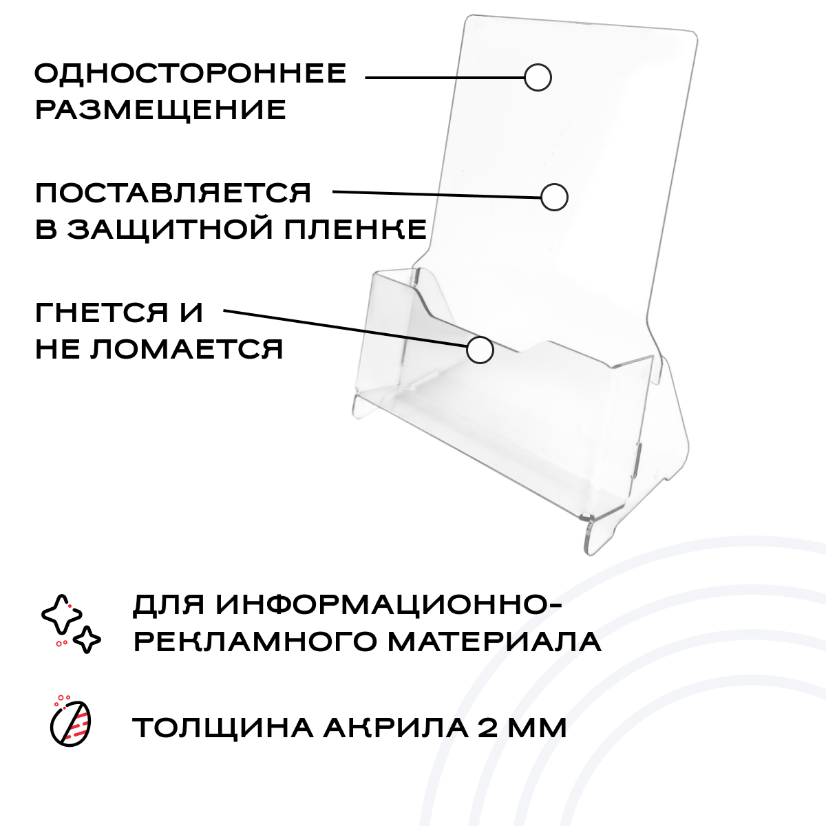 Настольная буклетница А5 с низким бортом (со спинкой), прозрачный акрил можно приобрести в интернет-магазине Lokos с доставкой или самовывозом по Челябинской области или доставкой до ТК с дальнейшей отправкой во все регионы Российской Федерации и СНГ.