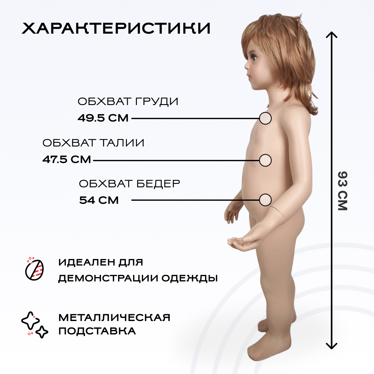 Манекен детский (девочка) Рост 93см, Бюст 49,5см, Талия 47,5см, Бедра 54см можно приобрести в интернет-магазине Lokos с доставкой или самовывозом по Челябинской области или доставкой до ТК с дальнейшей отправкой во все регионы Российской Федерации и СНГ.