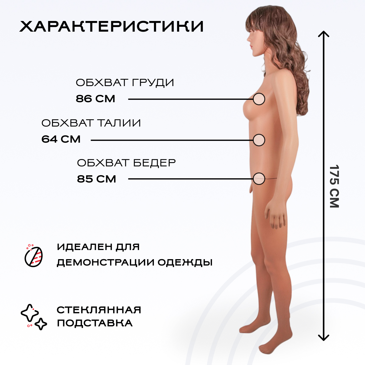 Манекен женский пластиковый 175см, 86-64-85см, размер 42-44 можно приобрести в интернет-магазине Lokos с доставкой или самовывозом по Челябинской области или доставкой до ТК с дальнейшей отправкой во все регионы Российской Федерации и СНГ.