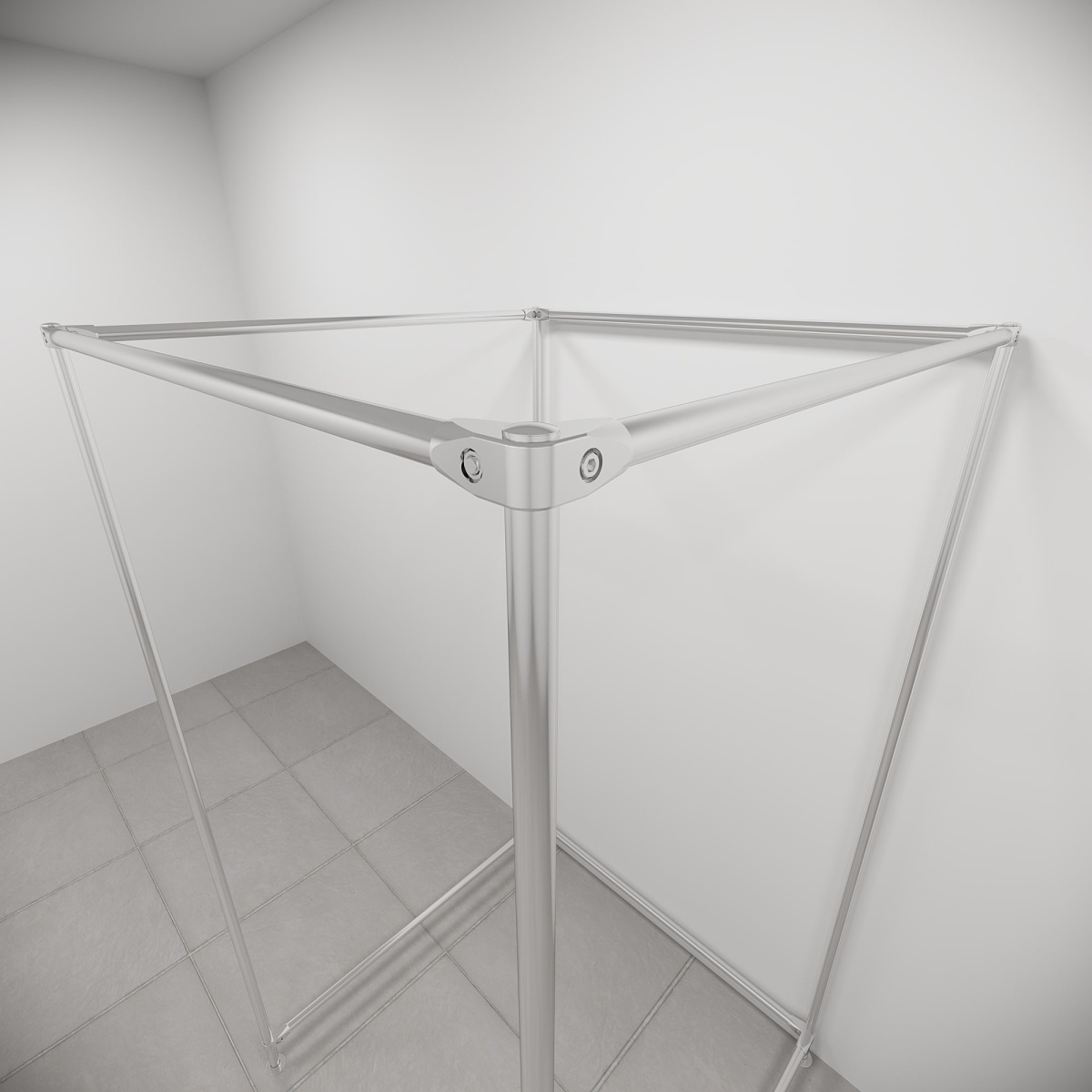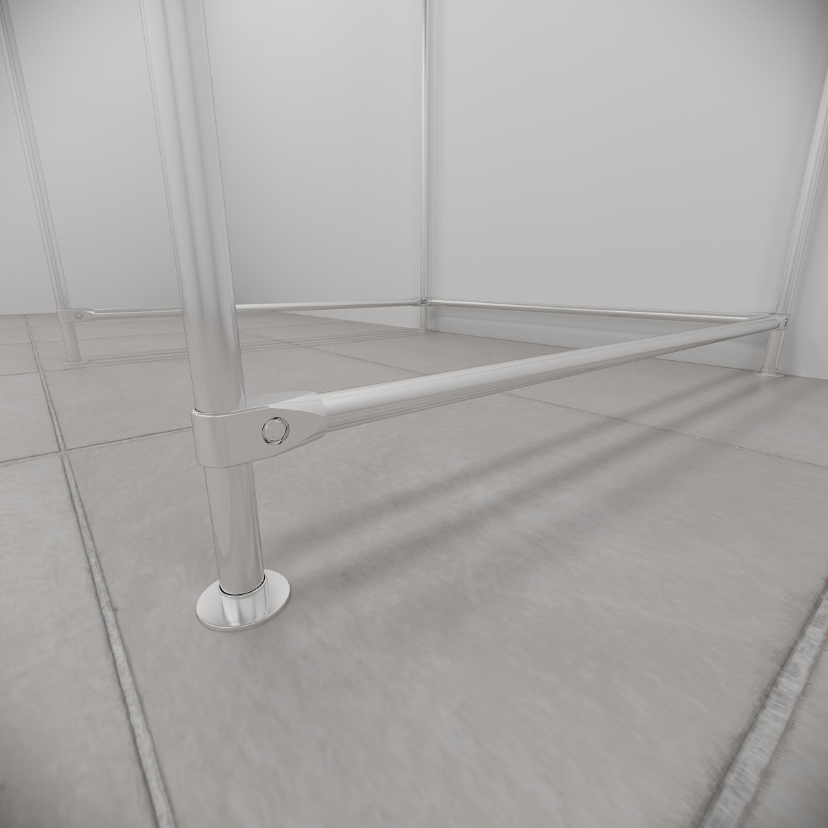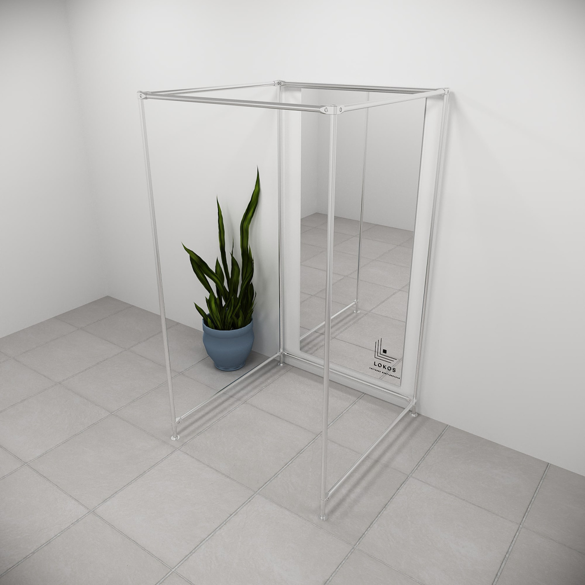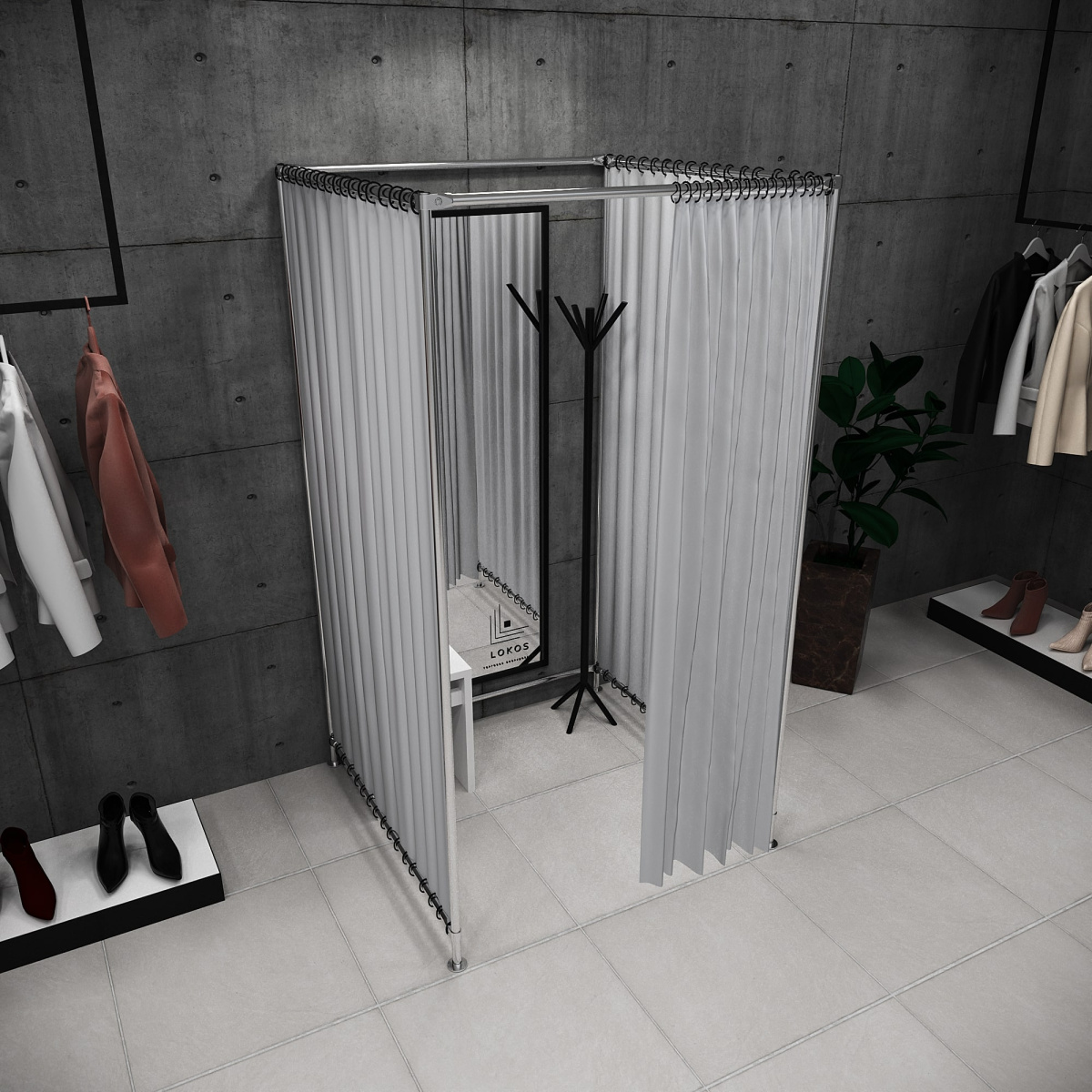Конструкция с четырьмя опорами гарантирует устойчивость и долговечность, а хромированное покрытие добавляет современный и стильный акцент в интерьер. Размеры примерочной 100*100 см, а высота 200 см. Конструкция позволяет эффективно использовать торговую площадь и обеспечивает достаточно места для примерки.
