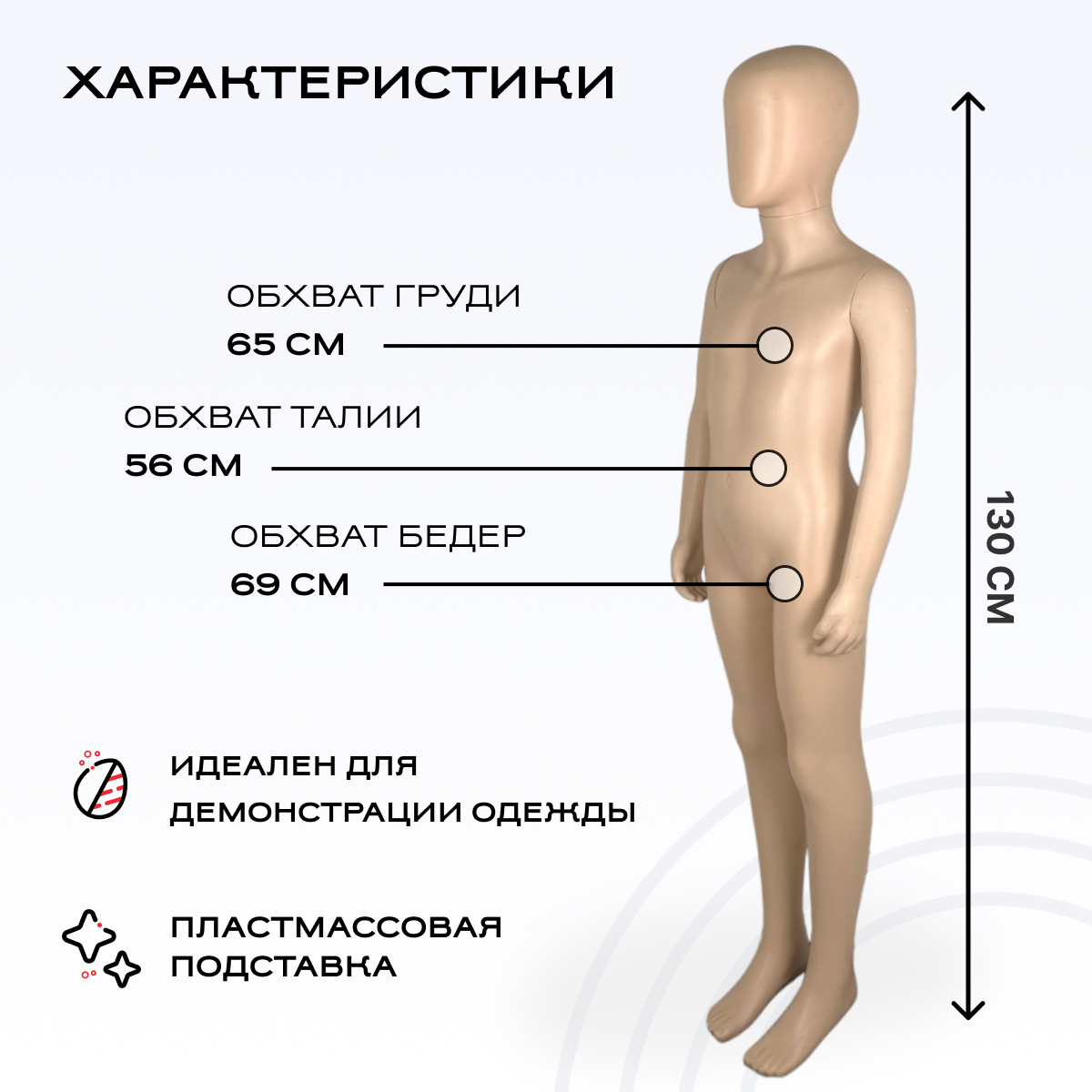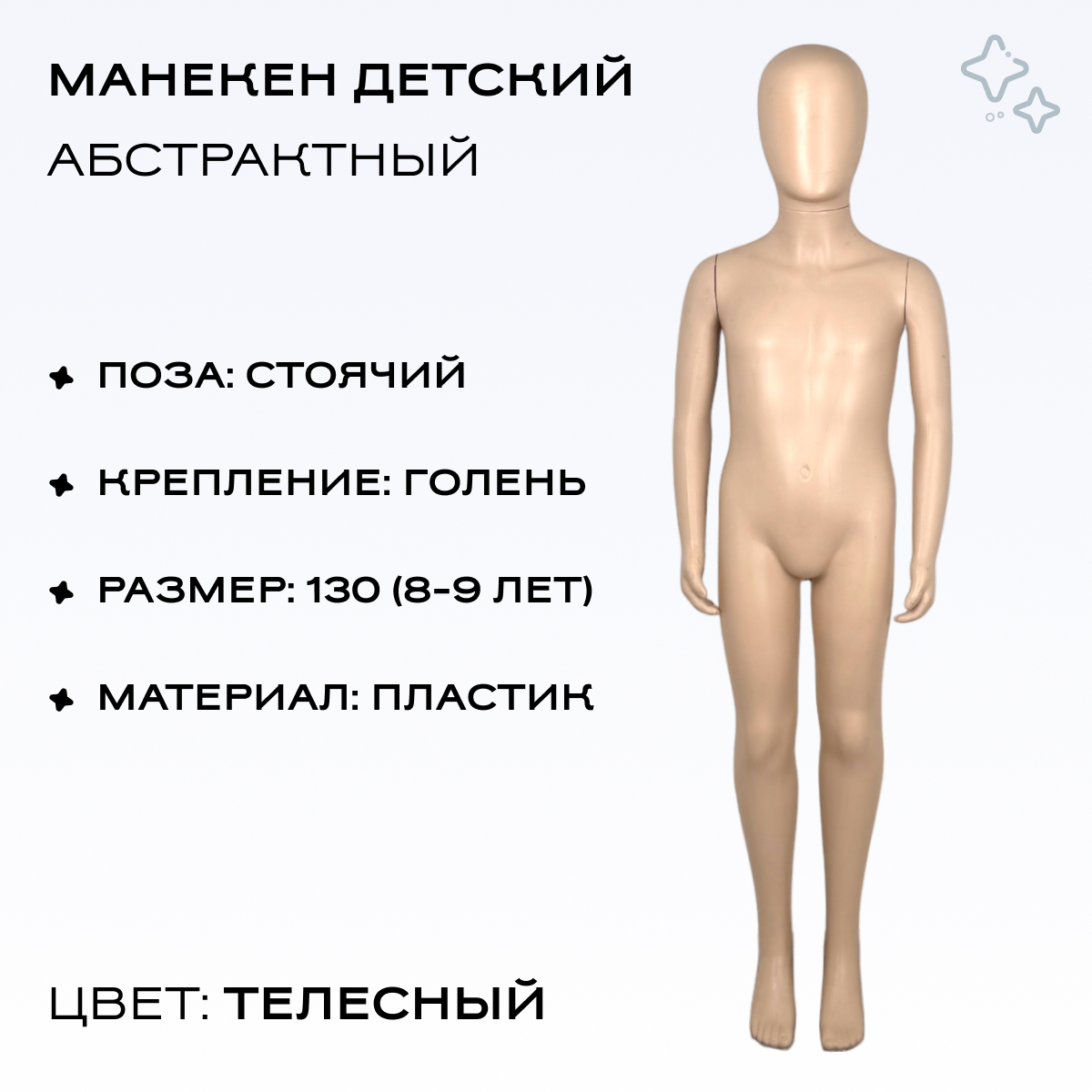 Манекен детский безликий пластиковый, 130см, 65-56-69см, цвет телесный можно приобрести в интернет-магазине Lokos с доставкой или самовывозом по Челябинской области или доставкой до ТК с дальнейшей отправкой во все регионы Российской Федерации и СНГ.