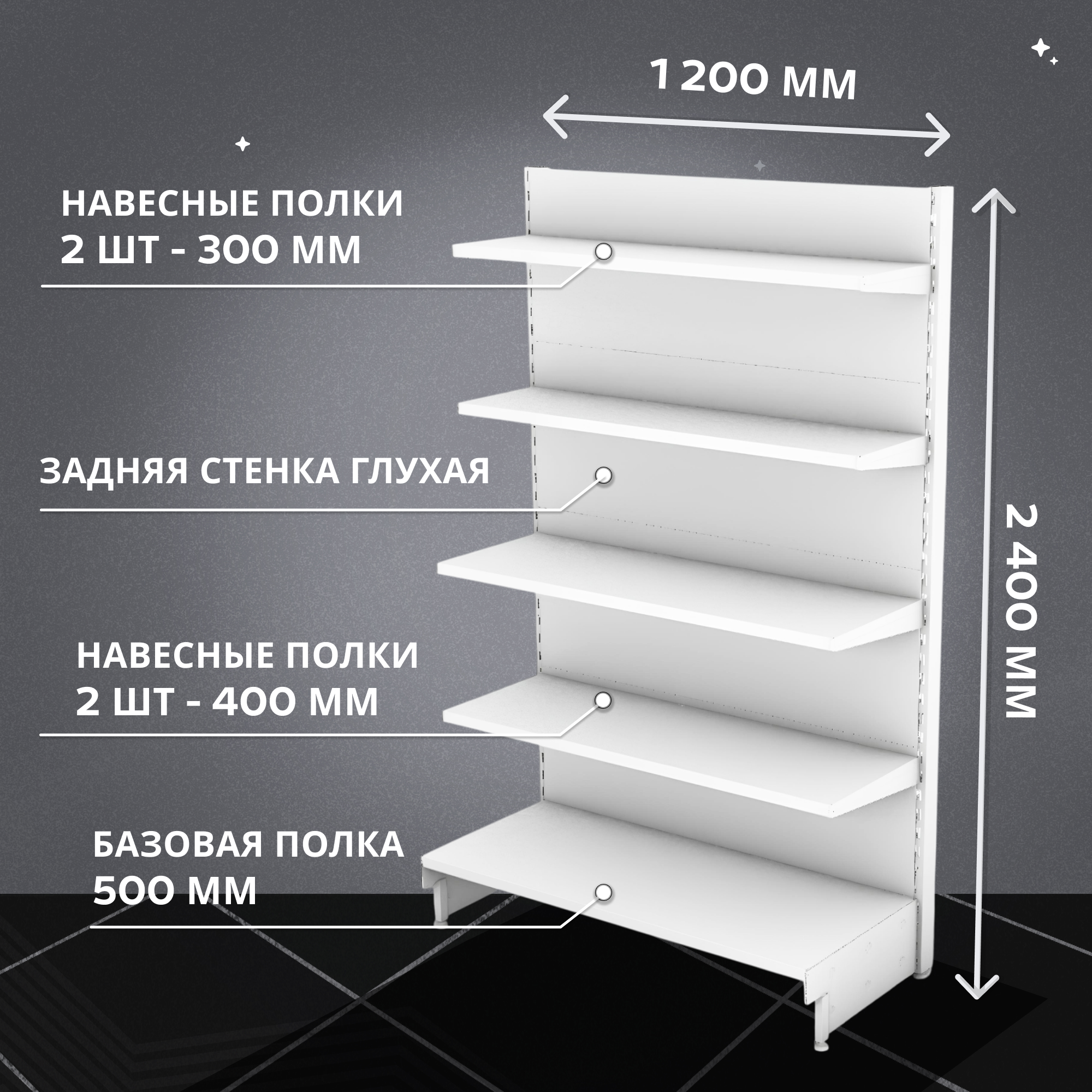 Стеллаж торговый пристенный 2400х1200 мм с полками можно приобрести в интернет-магазине Lokos с доставкой или самовывозом по Челябинской области или доставкой до ТК с дальнейшей отправкой во все регионы Российской Федерации и СНГ.