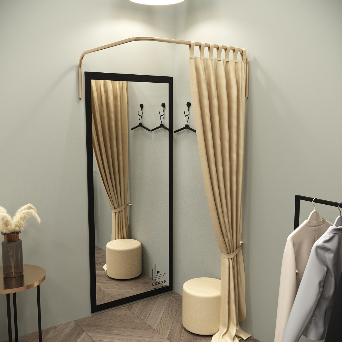 Кабина примерочная угловая в цвете золото — это стильное и функциональное решение для вашего магазина одежды или салона красоты. Она идеально впишется в интерьер и обеспечит комфорт вашим клиентам.