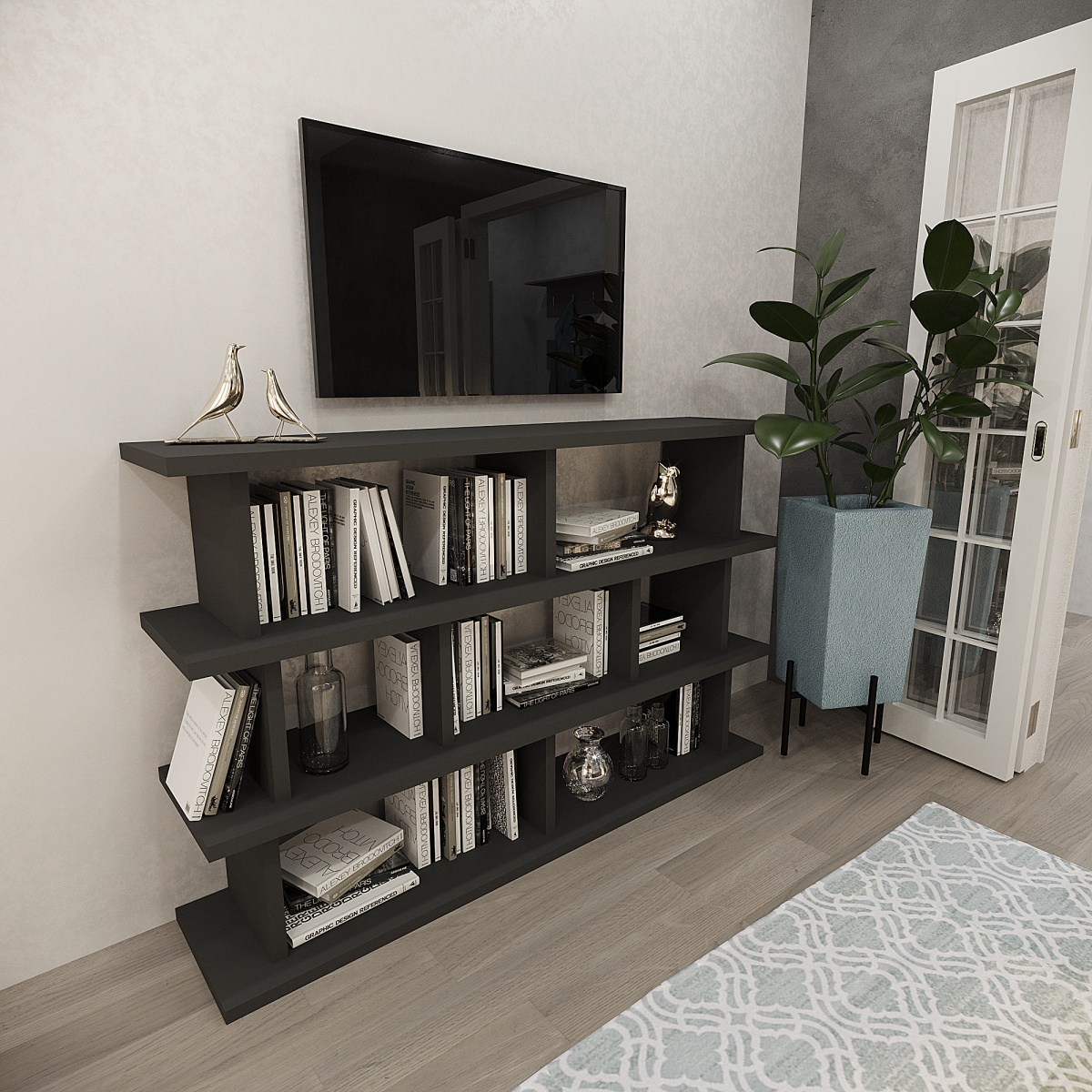 Низкий формат делает модель универсальной: её используют вдоль стены, под телевизором или как лёгкую перегородку для зонирования пространства.