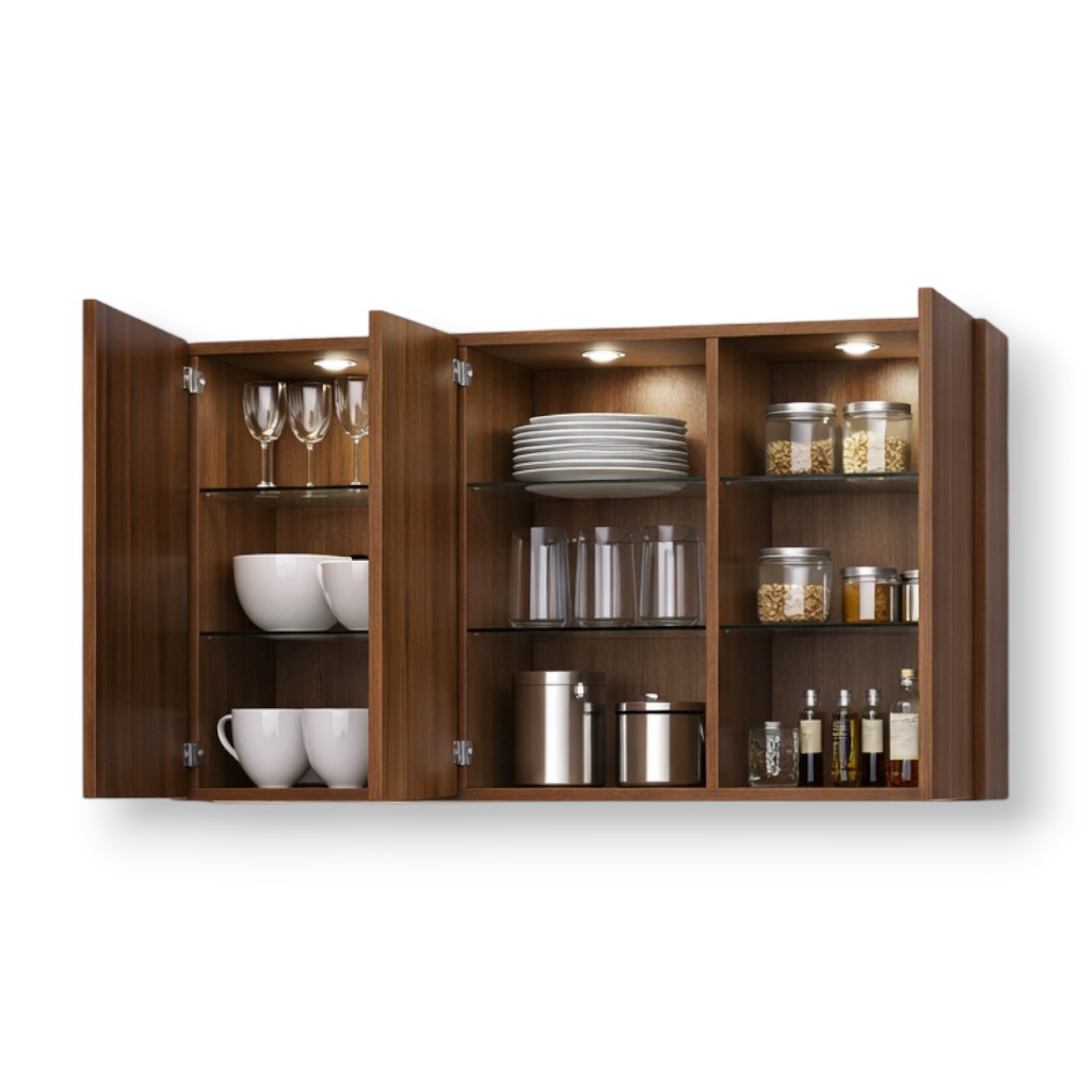 Кухонный навесной шкаф 3 двери, стеклянные полки, подсветка, орех «Walnut Prime», 120х70 см можно приобрести в интернет-магазине Lokos с доставкой или самовывозом по Челябинской области или доставкой до ТК с дальнейшей отправкой во все регионы Российской Федерации и СНГ.