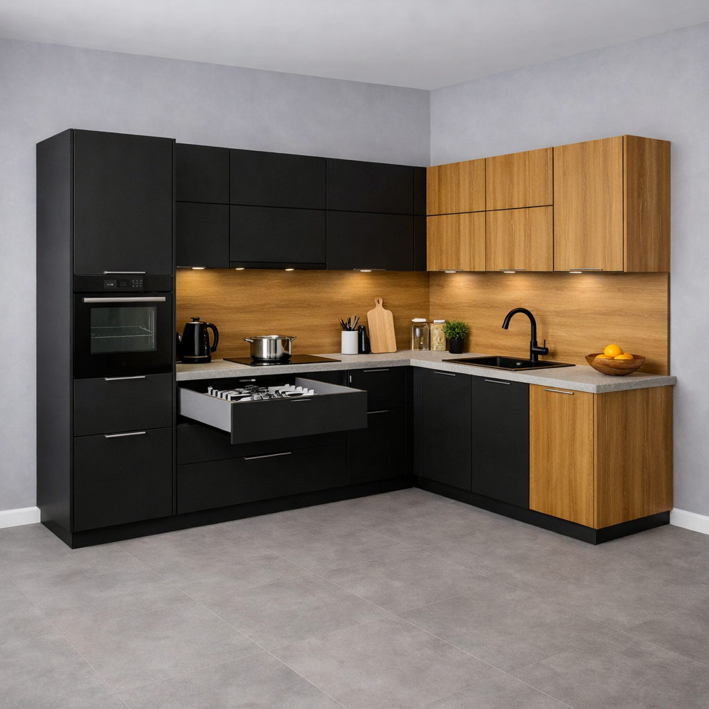 Кухонный гарнитур с высоким пеналом «Graphite Loft», чёрный, 320х160см можно приобрести в интернет-магазине Lokos с доставкой или самовывозом по Челябинской области или доставкой до ТК с дальнейшей отправкой во все регионы Российской Федерации и СНГ.