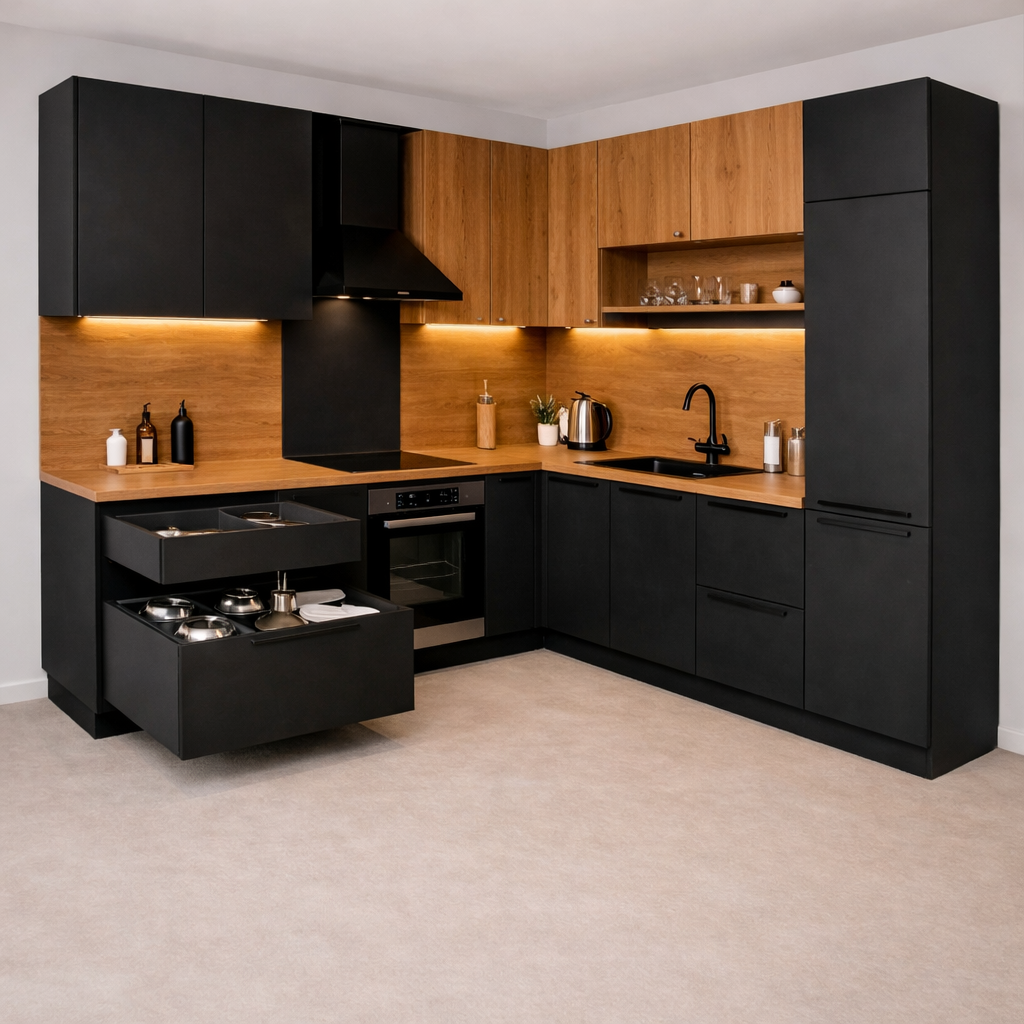 L-образный кухонный гарнитур «Graphite Line», чёрный, 250х220см можно приобрести в интернет-магазине Lokos с доставкой или самовывозом по Челябинской области или доставкой до ТК с дальнейшей отправкой во все регионы Российской Федерации и СНГ.