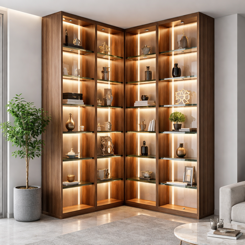 Угловой стеллаж с подсветкой напольный "Glow Corner", 1000х2200 мм, орех можно приобрести в интернет-магазине Lokos с доставкой или самовывозом по Челябинской области или доставкой до ТК с дальнейшей отправкой во все регионы Российской Федерации и СНГ.