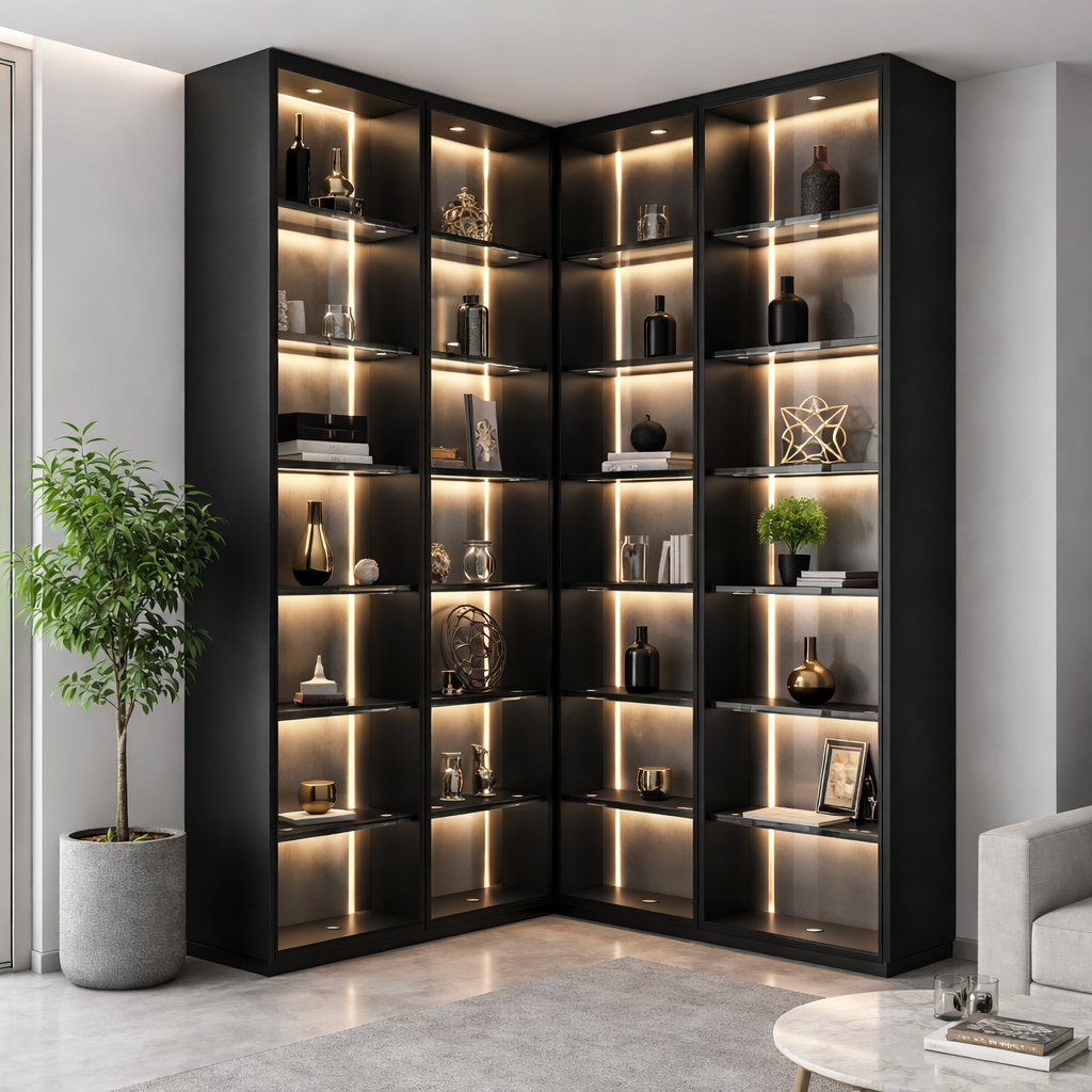 Угловой стеллаж напольный с полками и подсветкой "Glow Corner", 1000х2200 мм, черный можно приобрести в интернет-магазине Lokos с доставкой или самовывозом по Челябинской области или доставкой до ТК с дальнейшей отправкой во все регионы Российской Федерации и СНГ.