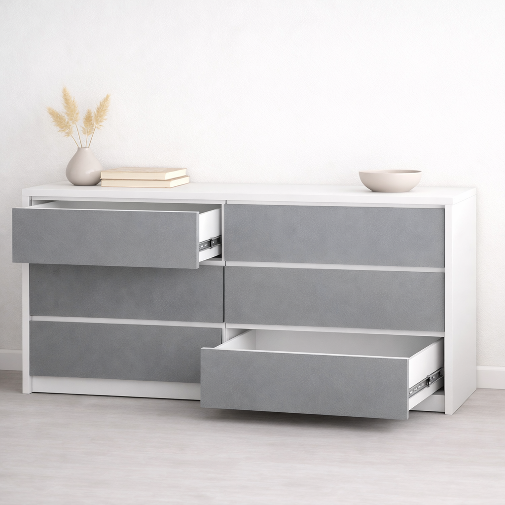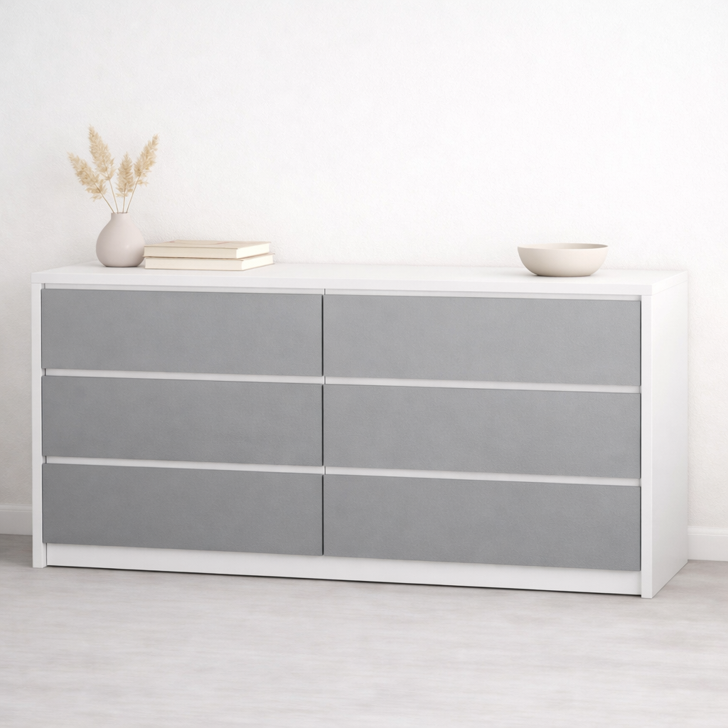 Интерьерный комод 6 ящиков Clean Line белый+серый 140×80см можно приобрести в интернет-магазине Lokos с доставкой или самовывозом по Челябинской области или доставкой до ТК с дальнейшей отправкой во все регионы Российской Федерации и СНГ.