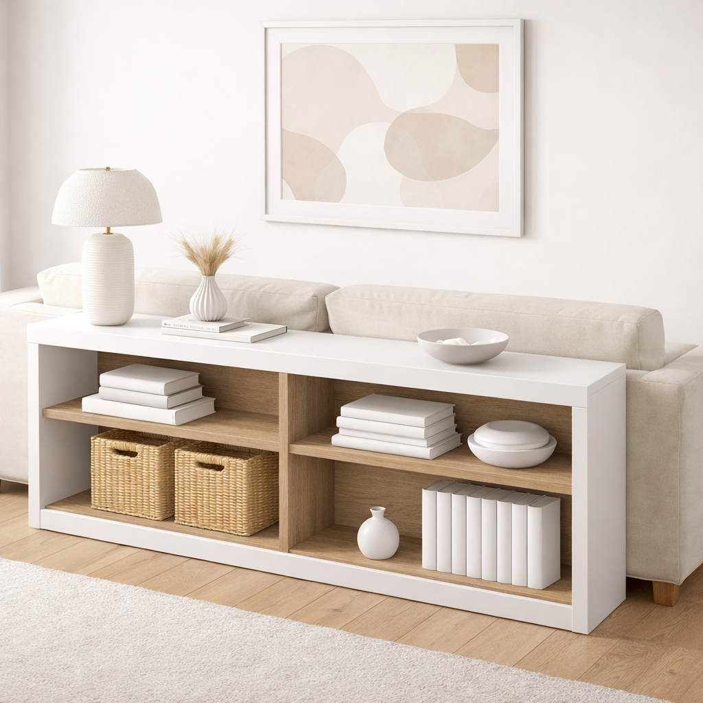 Приставной столик за диваном белый-дуб сонома "Cubo", 140×70 см можно приобрести в интернет-магазине Lokos с доставкой или самовывозом по Челябинской области или доставкой до ТК с дальнейшей отправкой во все регионы Российской Федерации и СНГ.