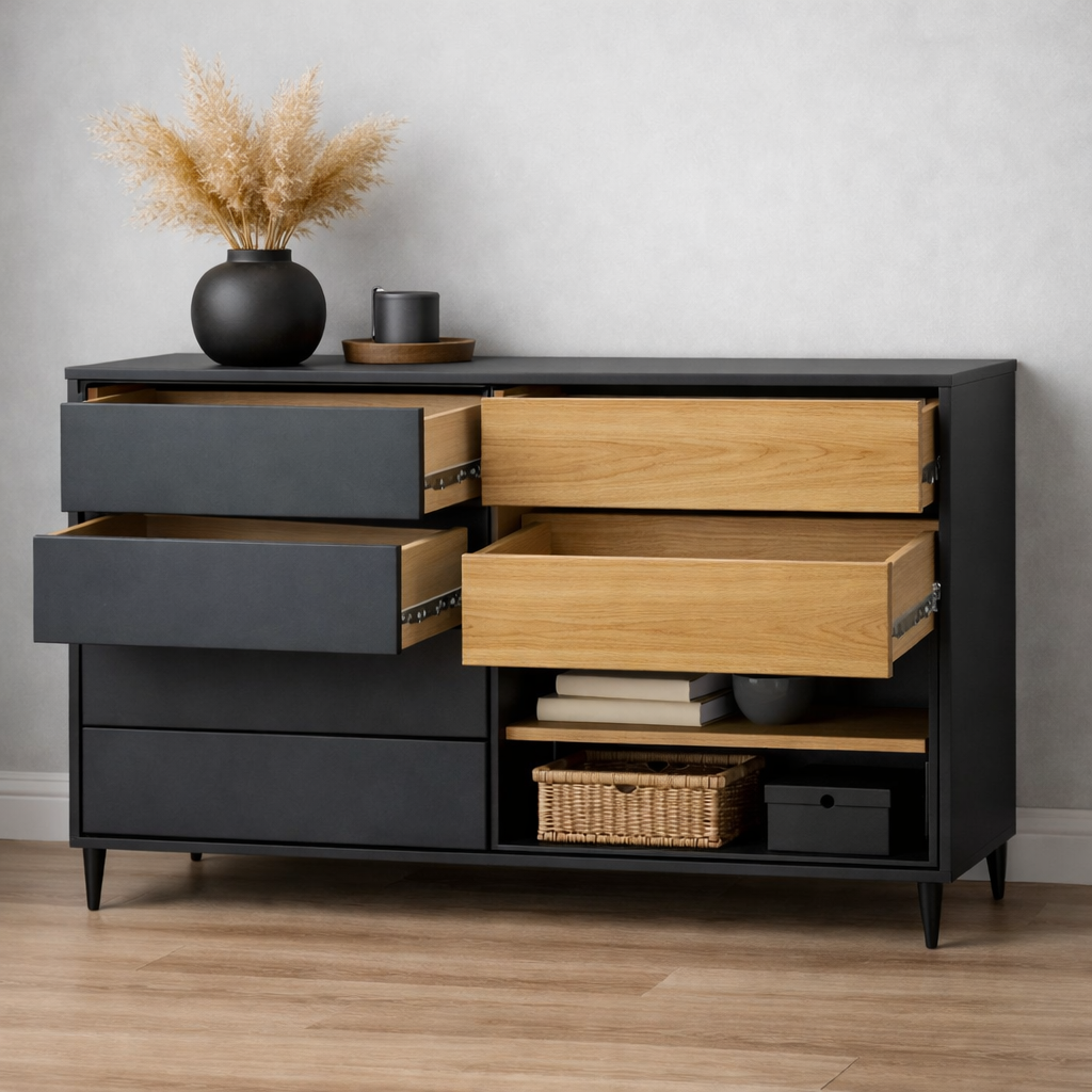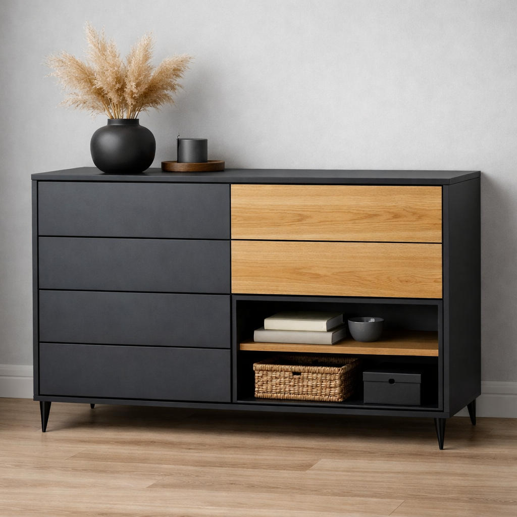 Комод из ЛДСП Nord графит+дуб 140×80см можно приобрести в интернет-магазине Lokos с доставкой или самовывозом по Челябинской области или доставкой до ТК с дальнейшей отправкой во все регионы Российской Федерации и СНГ.
