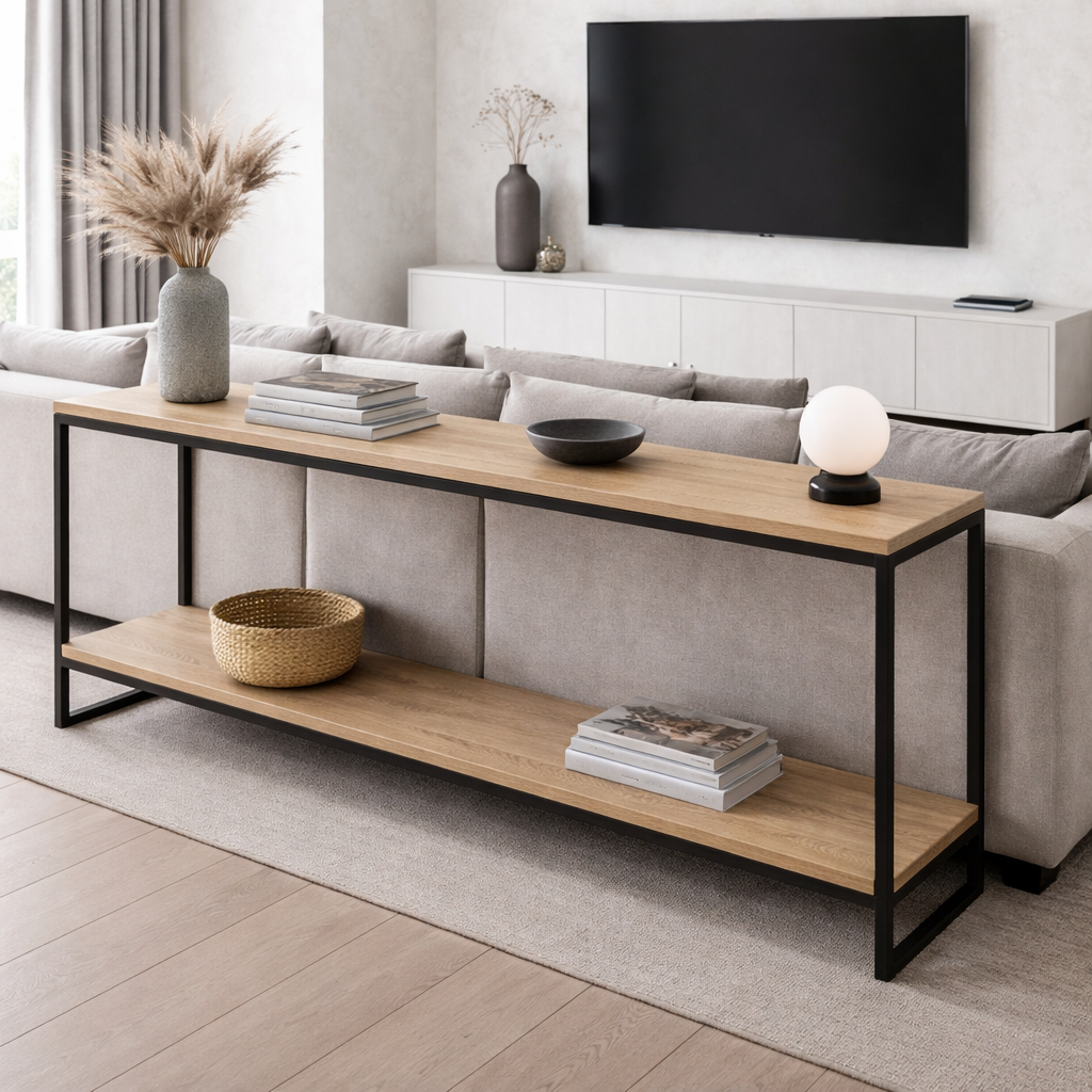 Консольный столик лофт за диваном дуб сонома черный металл можно приобрести в интернет-магазине Lokos с доставкой или самовывозом по Челябинской области или доставкой до ТК с дальнейшей отправкой во все регионы Российской Федерации и СНГ.