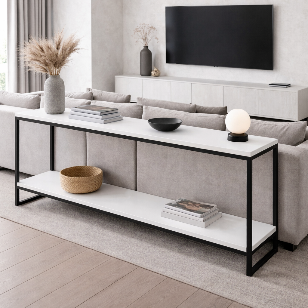 Узкая консоль в гостиную белая лофт 1400×850×300 мм можно приобрести в интернет-магазине Lokos с доставкой или самовывозом по Челябинской области или доставкой до ТК с дальнейшей отправкой во все регионы Российской Федерации и СНГ.