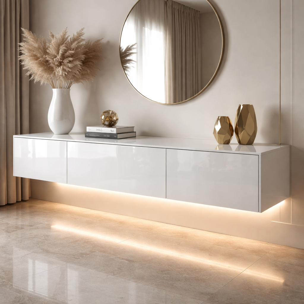 Подвесная глянцевая тумба под телевизор белая с подсветкой "Glow", 160х30 см можно приобрести в интернет-магазине Lokos с доставкой или самовывозом по Челябинской области или доставкой до ТК с дальнейшей отправкой во все регионы Российской Федерации и СНГ.