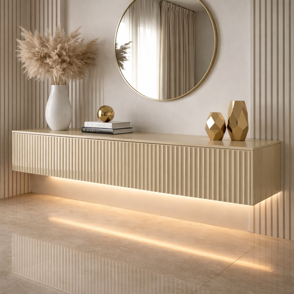 Подвесная ТВ тумба бежевый глянец рифленая "Gloss Sand", 160х40 см можно приобрести в интернет-магазине Lokos с доставкой или самовывозом по Челябинской области или доставкой до ТК с дальнейшей отправкой во все регионы Российской Федерации и СНГ.