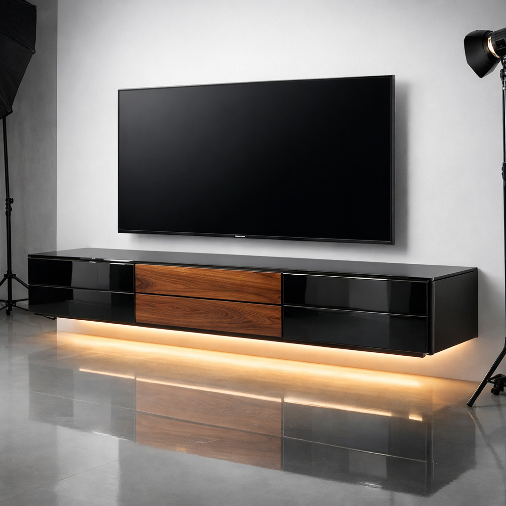 Комбинированная ТВ тумба черная глянцевая с вставками под дерево "Dual Wood Black", 160х40 см можно приобрести в интернет-магазине Lokos с доставкой или самовывозом по Челябинской области или доставкой до ТК с дальнейшей отправкой во все регионы Российской Федерации и СНГ.
