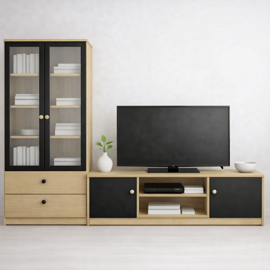 Гарнитур с открытой нишей для гостиной Fjord светлый дуб+чёрный 180×190см можно приобрести в интернет-магазине Lokos с доставкой или самовывозом по Челябинской области или доставкой до ТК с дальнейшей отправкой во все регионы Российской Федерации и СНГ.
