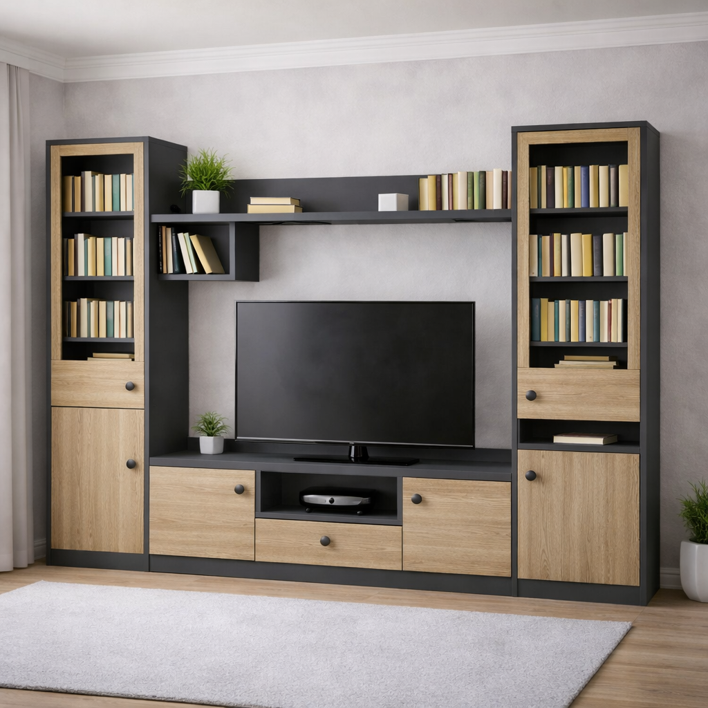 Стенка в современном стиле под телевизор с хранением дуб сонома графит "Urban Storage", 200х200 см можно приобрести в интернет-магазине Lokos с доставкой или самовывозом по Челябинской области или доставкой до ТК с дальнейшей отправкой во все регионы Российской Федерации и СНГ.