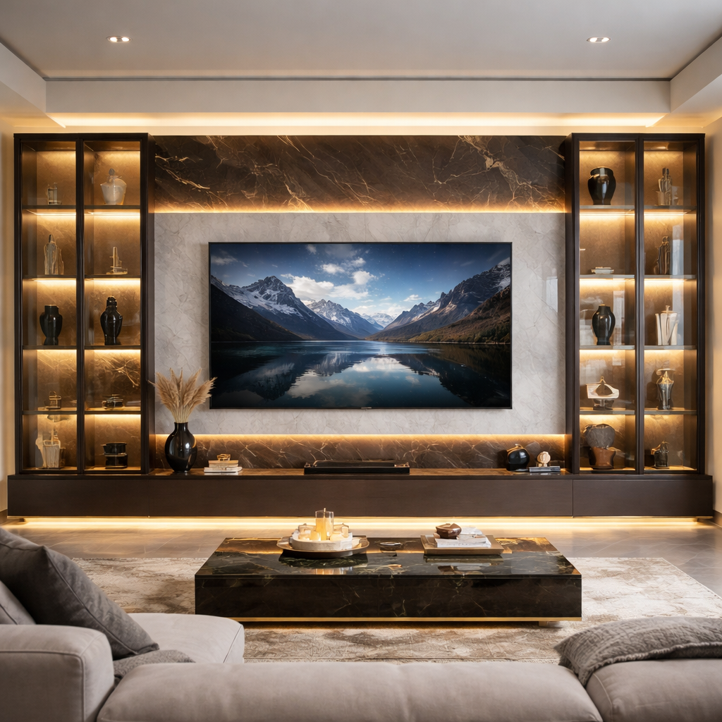 Дизайнерская стенка под телевизор с подсветкой премиум коричневый "Luxe Light Wall", 300х220 см можно приобрести в интернет-магазине Lokos с доставкой или самовывозом по Челябинской области или доставкой до ТК с дальнейшей отправкой во все регионы Российской Федерации и СНГ.