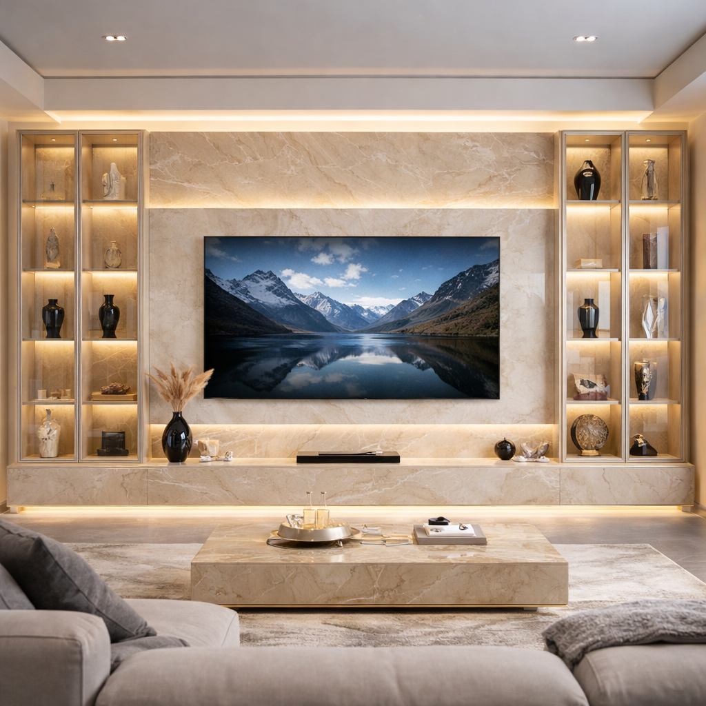 Светлая стенка под телевизор с подсветкой бежевый мрамор "Soft Marble Light", 300х220 см можно приобрести в интернет-магазине Lokos с доставкой или самовывозом по Челябинской области или доставкой до ТК с дальнейшей отправкой во все регионы Российской Федерации и СНГ.