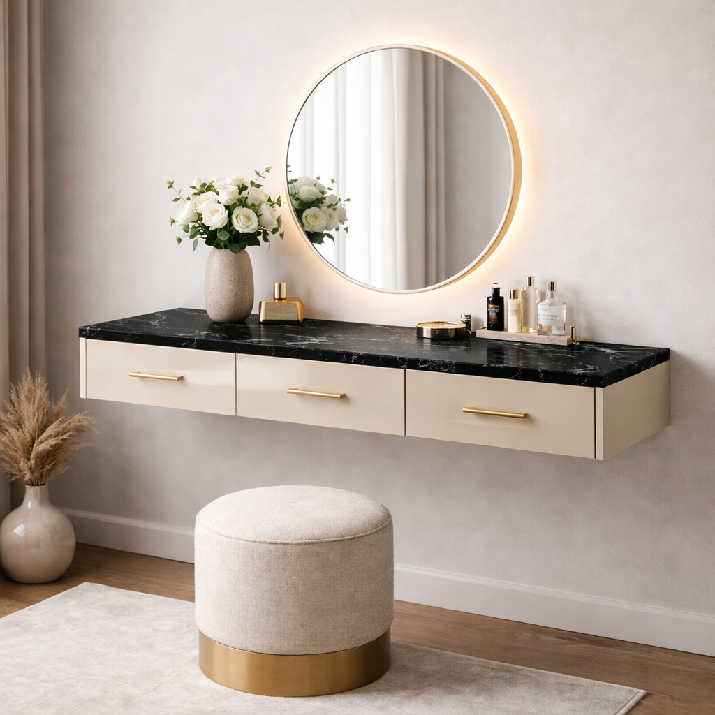 Туалетный столик подвесной с черной мраморной столешницей бежевый можно приобрести в интернет-магазине Lokos с доставкой или самовывозом по Челябинской области или доставкой до ТК с дальнейшей отправкой во все регионы Российской Федерации и СНГ.